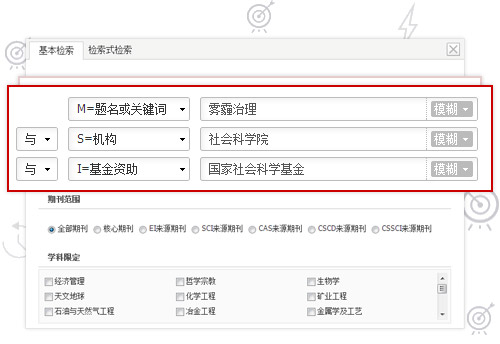 向导式检索:如需查看“雾霾治理”方面的,作者所属机构为“社会科学院”的,由“国家社会科学基金”赞助的期刊文献,则可以在高级检索-向导式检索页面做以下设置。