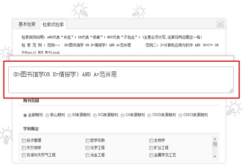 读者可在检索框中直接输入字段标识和逻辑运算符来发起检索。如若系统显示未找到结果,则表示输入的检索式有错或者在该条件检索下无结果,请返回检索界面重新输入正确检索表达式或切换到其他方式获得检索内容。检索规则说明:AND代表“并且”;OR代表“或者”;NOT代表“不包含”;(注意必须大写,运算符两边需空一格),检索式范例: (K=图书馆学OR K=情报学) AND A=范并思。