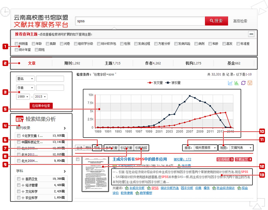 云南高校图书馆联盟文献共享服务平台提供了基于检索结果的发文被引分析、分面聚类筛选、多种排序方式等检索优化服务。方便用户快速找到目标期刊文献。