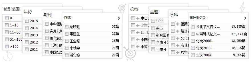 检索结果页面的左聚类面板支持“被引范围”、“作者”、“机构”、“年份”、“期刊”、“期刊收录”、“学科”、“主题”等多类别层叠筛选,您可以在任意检索条件下对检索结果进行再次组配,以提高资源筛选效率。